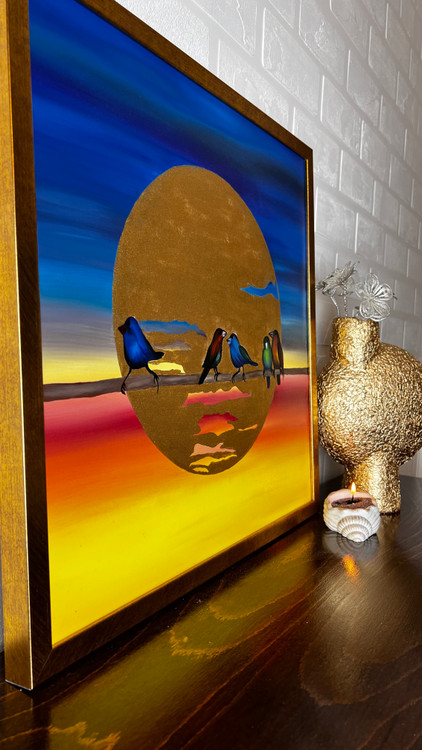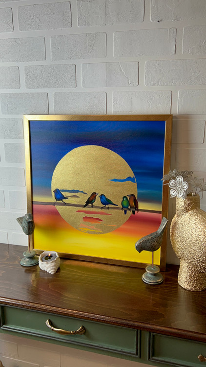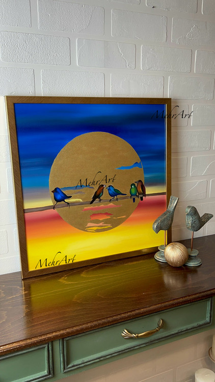 تابلو دکوراتیو رنگ روغن مهرآرت گنجشک و خورشید طلا کاردست