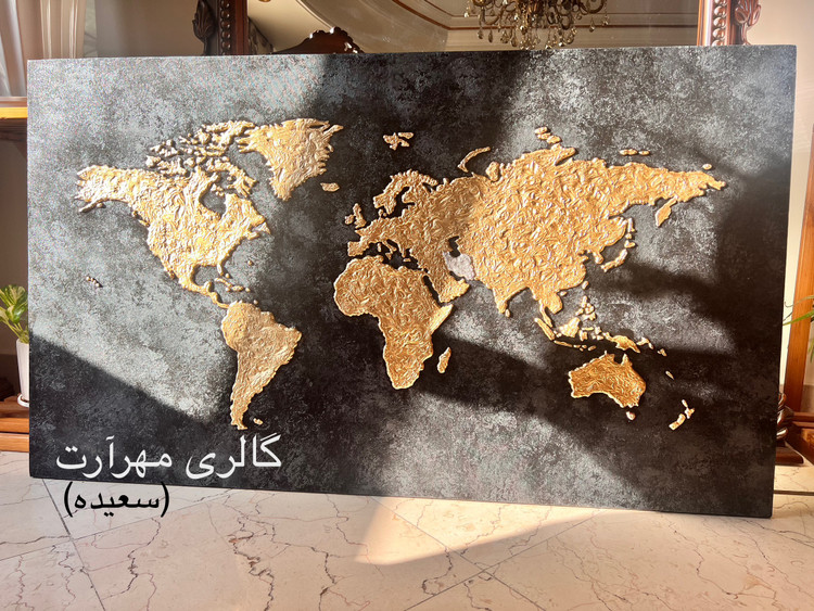 تابلو جهان برجسته با ورق طلا اجرا شده در زمینهی پتینه و ایران مجزا با ورق نقره.