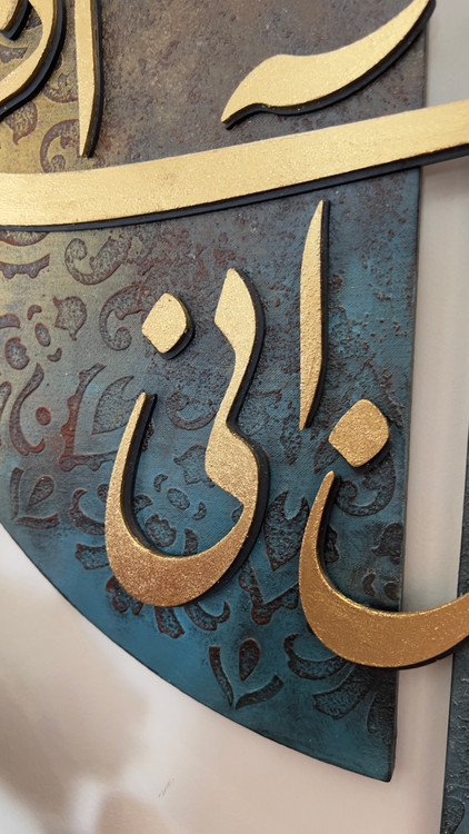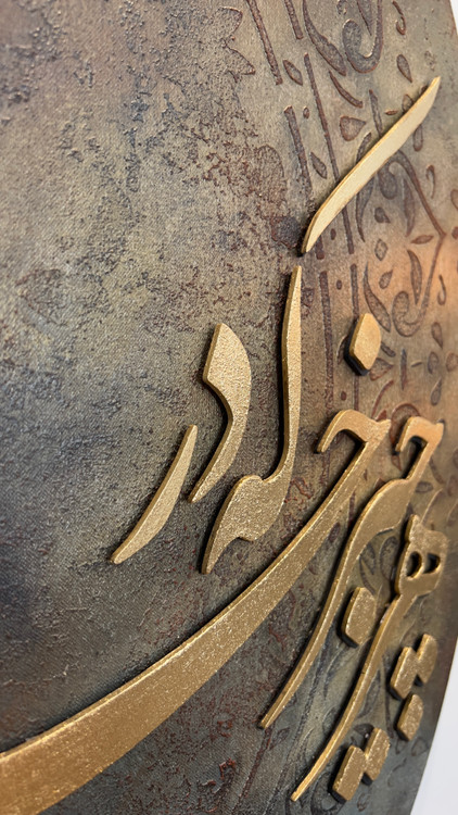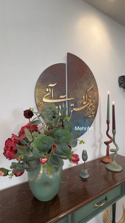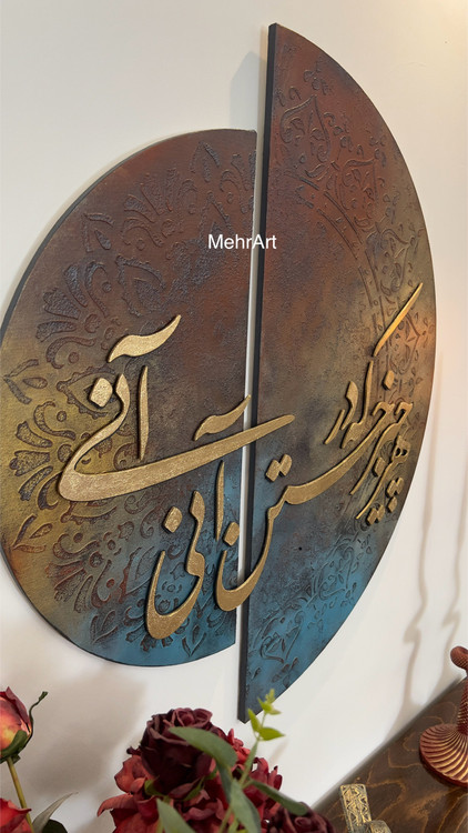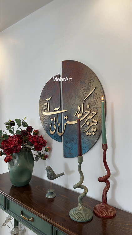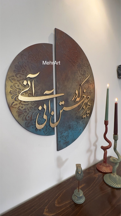 تابلو خط برجسته ی دو لت با زمینه ی پتینه ی برجسته و شعر برجسته ی چوبی دوبل و خط نستعلیق، جلوه ی زیبایی از ادبیات و هنر اصیل ایرانی رو به تصویر کشیده است.