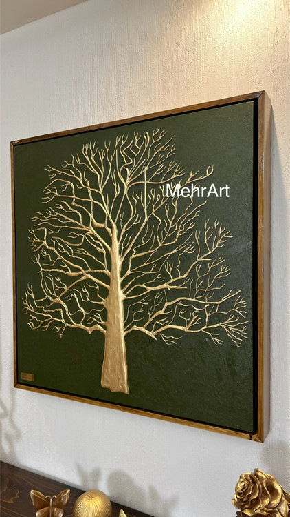 تابلو درخت طلایی در زمینه ی پتینهی طرح چرم