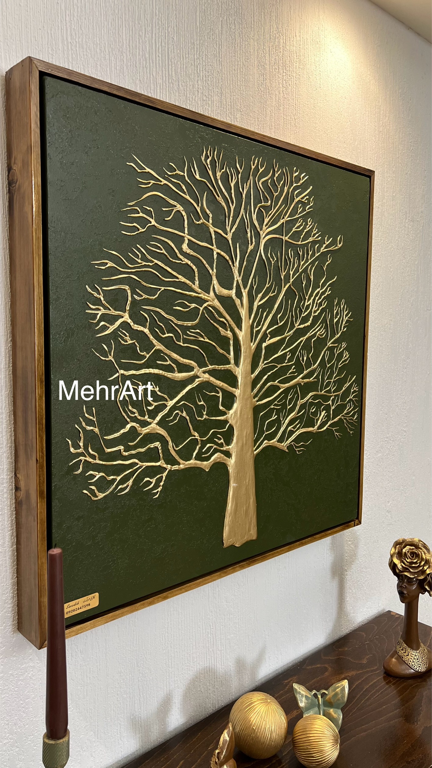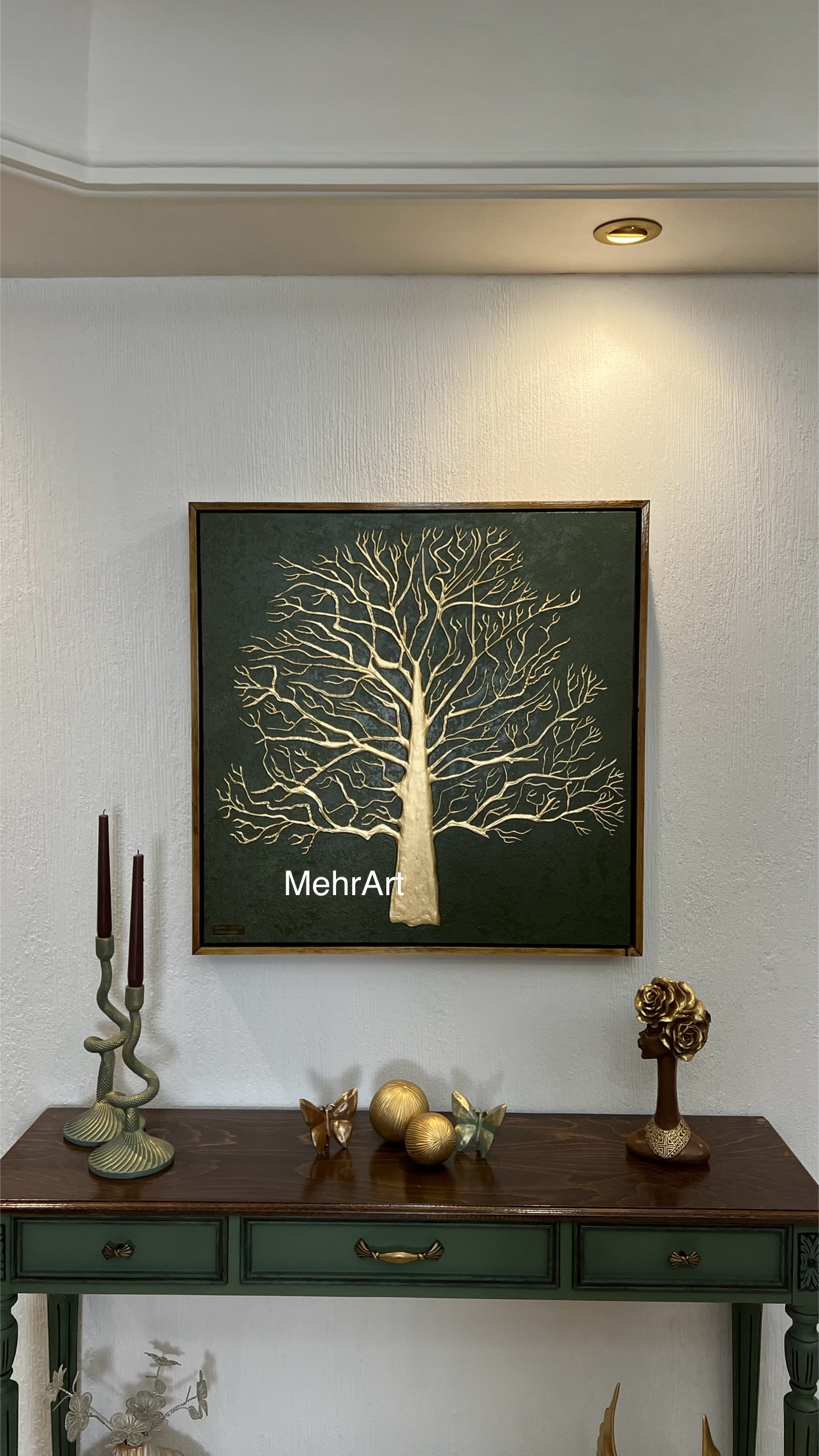 تابلو درخت طلایی در زمینه ی پتینهی طرح چرم